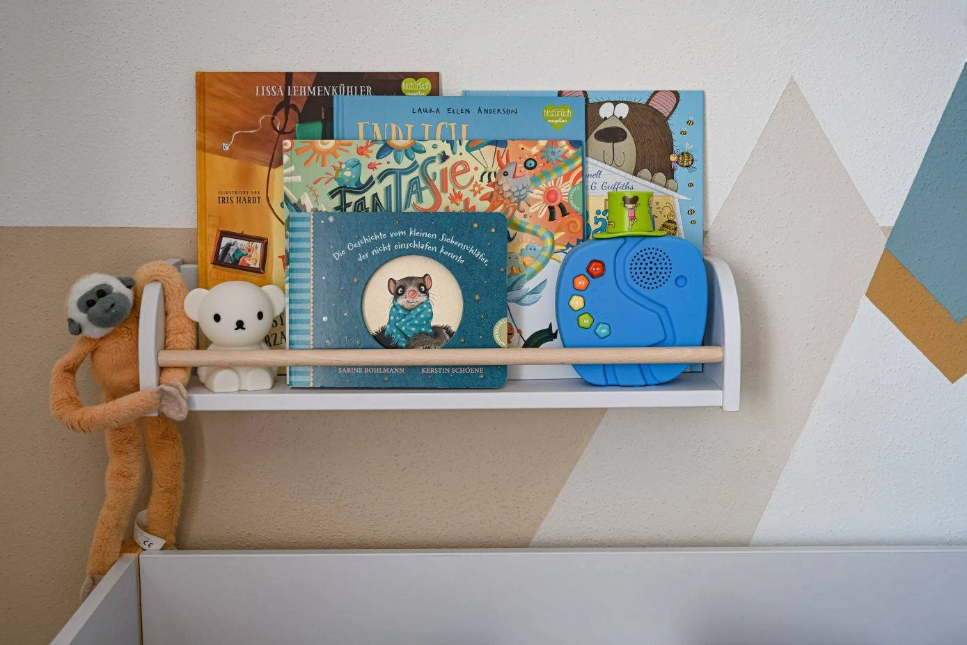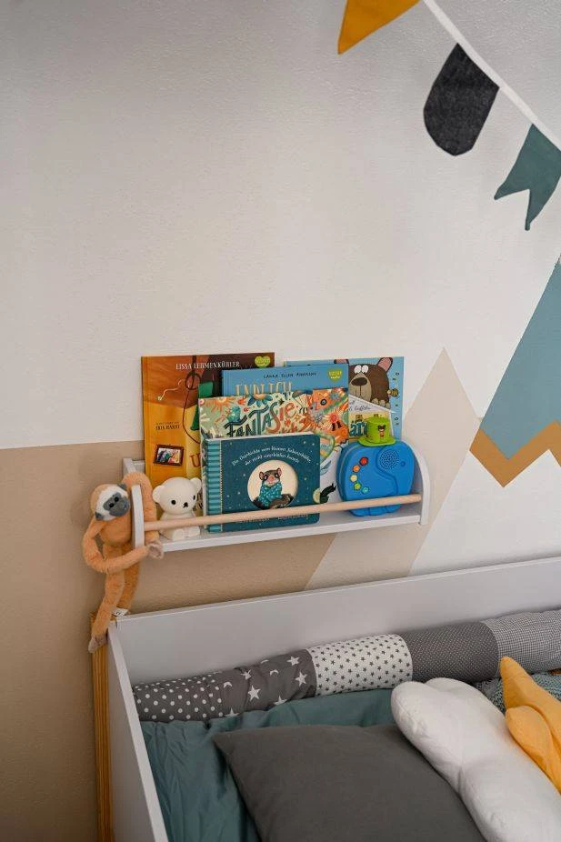 Półka jest bardzo ważnym elementem wyposażenia pokoiku małego dziecka. Gdy dziecko jest małe można ją powiesić w zasięgu jego ręki, co pozytywnie wpłynie na jego rozwój, a w miarę wzrostu dziecka zmienić jej położenie na ścianie. Subtelna i ponadczasowa kolorystyka będzie pięknie prezentowała się w każdym wnętrzu.