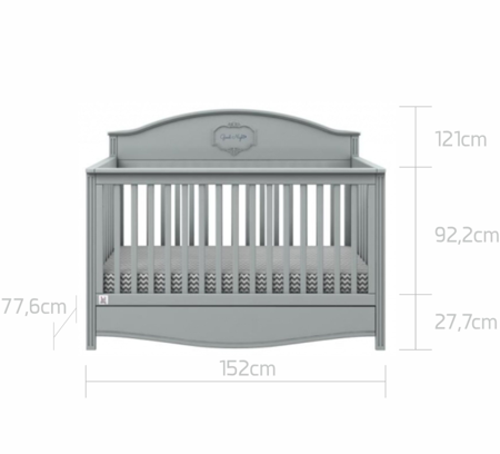 Łóżeczko wyprodukowane jest z litego drewna (buk) w połączeniu z wysokiej jakości płytą MDF i w całości lakierowane jest na kolor neutralnej szarości (GREY). Jest eleganckie w formie i szlachetnie wykończone. Pieknie komponuje się z uroczą kolekcją Ines neutral grey (szara).