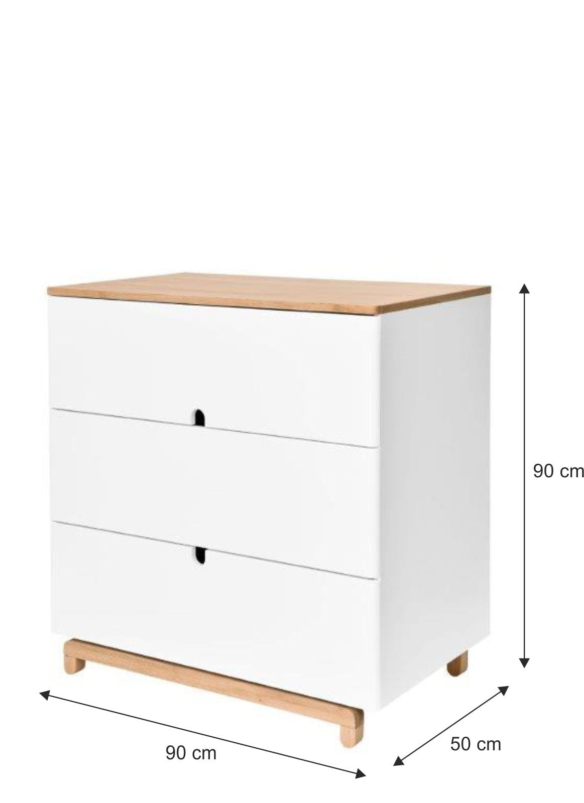Komoda obok łóżeczka jest bardzo ważnym meblem w pokoju dziecięcym. Posiada obszerne szuflady, które pomieszczą mniejsze i większe ubranka, akcesoria oraz zabawki. Zamiast tradycyjnych uchwytów zastosowaliśmy wycięcia w kształcie półkoli, które będą przyjazne do otwierania tak dla dzieci jak i dorosłych. Bardzo praktycznym rozwiązaniem jest również możliwość zamontowania na blacie komody przewijaka, aby umożliwić rodzicom bezpiecznie przewijanie i pielęgnację dziecka w okresie wczesnego dzieciństwa.