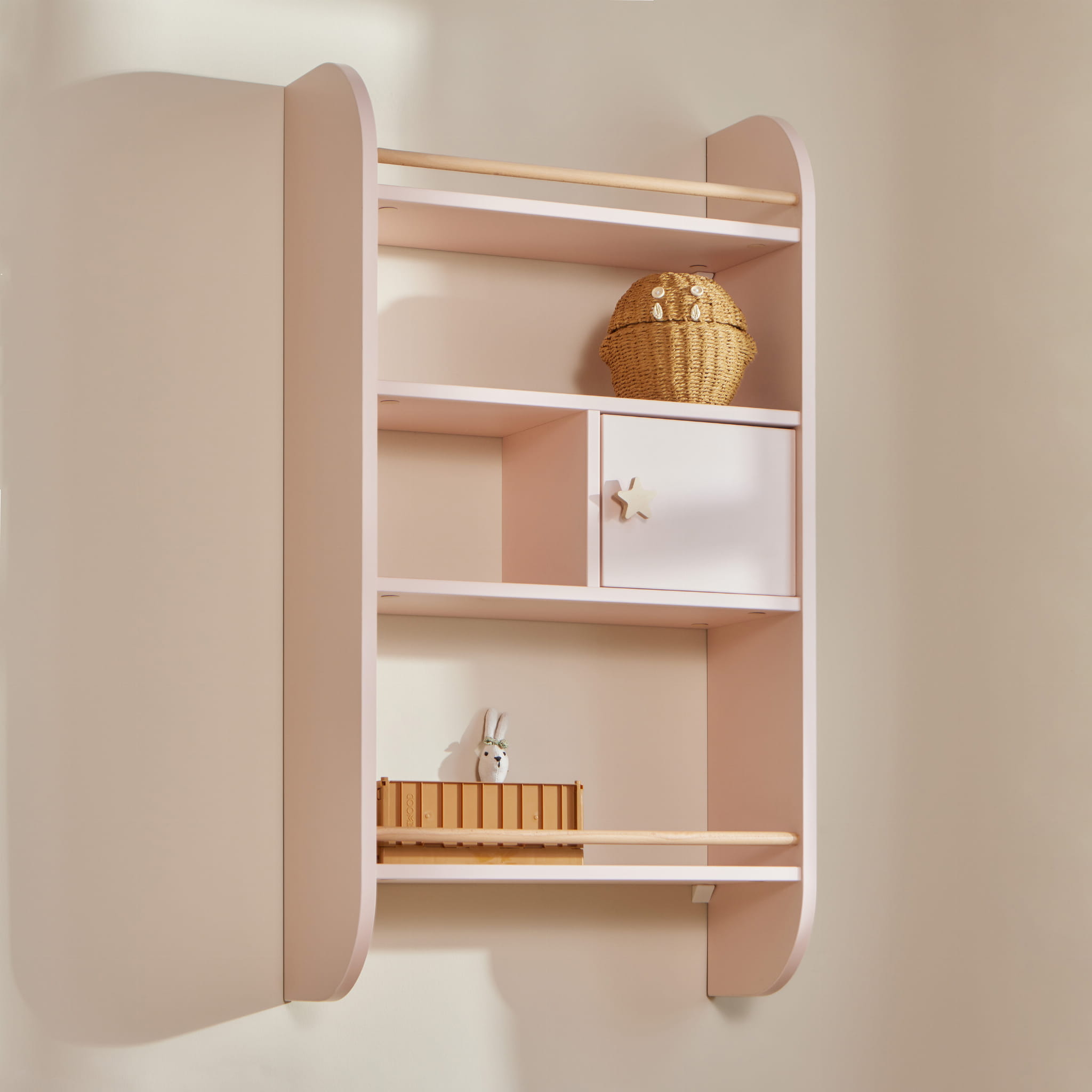 Półka z kolekcji Rainbow jest idealnie dostosowana do potrzeb zarówno najmniejszych jak i starszych dzieci. Wyposażona została w szafeczkę oraz trzy półeczki przez co jest bardzo funkcjonalna oraz pojemna. Może zostać zamontowana, nad biurkiem, łóżkiem oraz nisko przy podłodze umożliwiając swobodny dostęp do książeczek, zabawek i innych bibelotów. Dwie półki zakończone są drewnianym ogranicznikiem, który dodatkowo zabezpiecza książki przed wypadaniem.