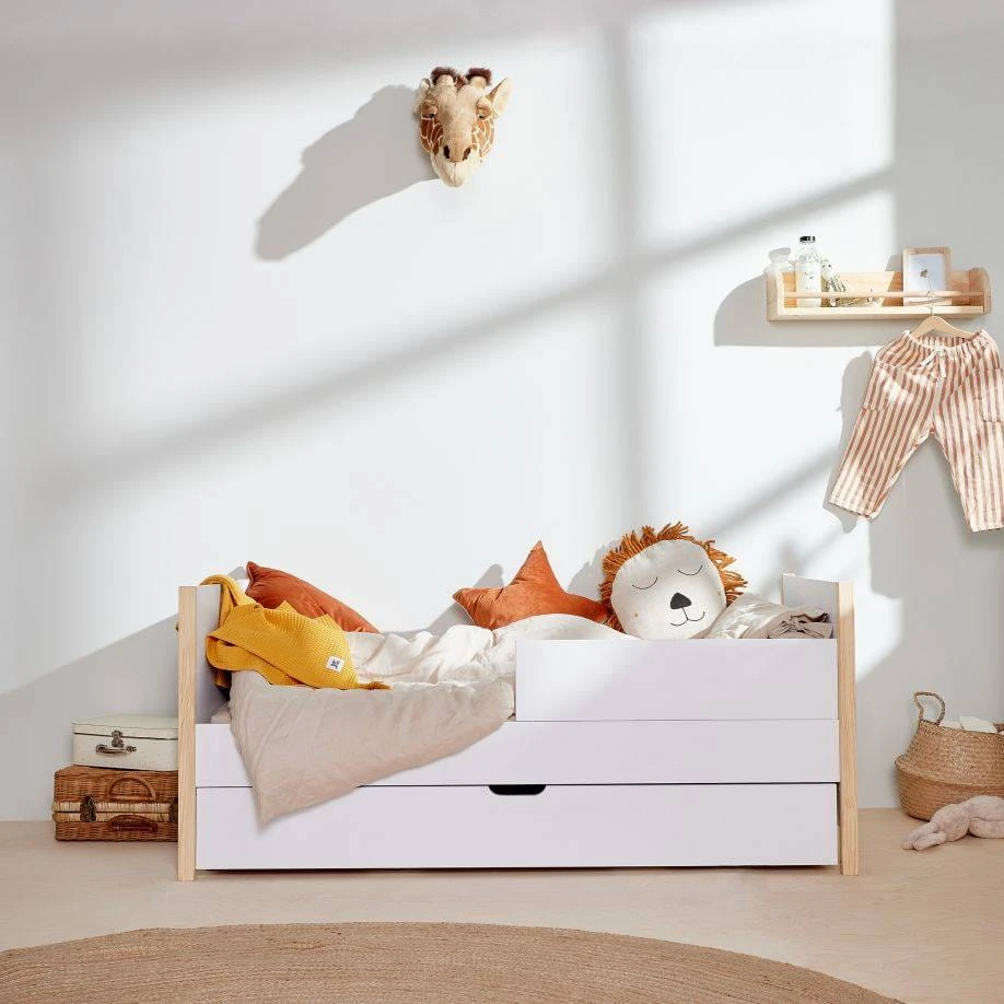 ->w zestawie dwie barierki ochronne, które powstają podczas transformacji łóżeczka w tapczanik i zabezpieczają dziecko przed wypadnięciem z łóżeczka podczas snu