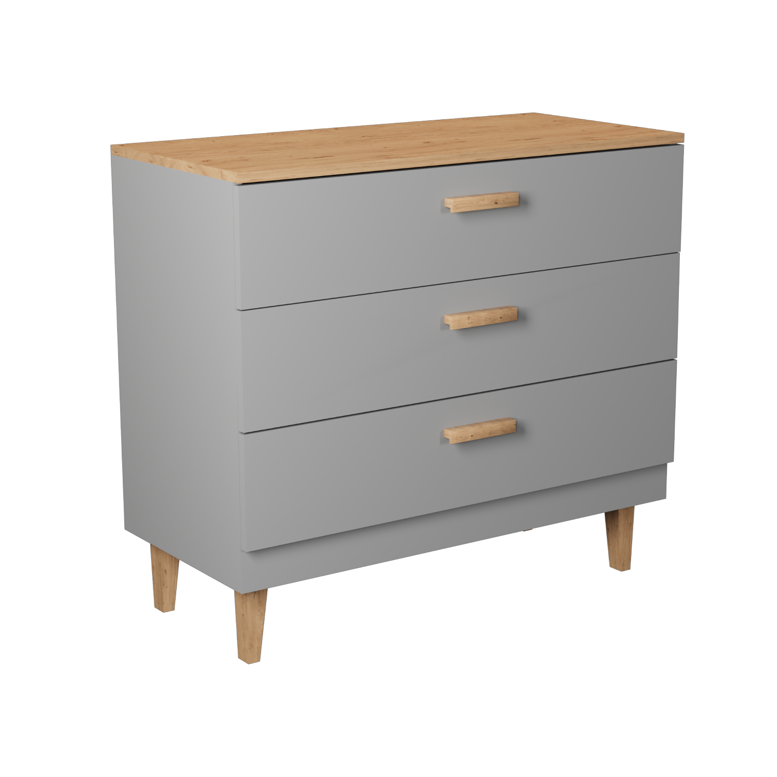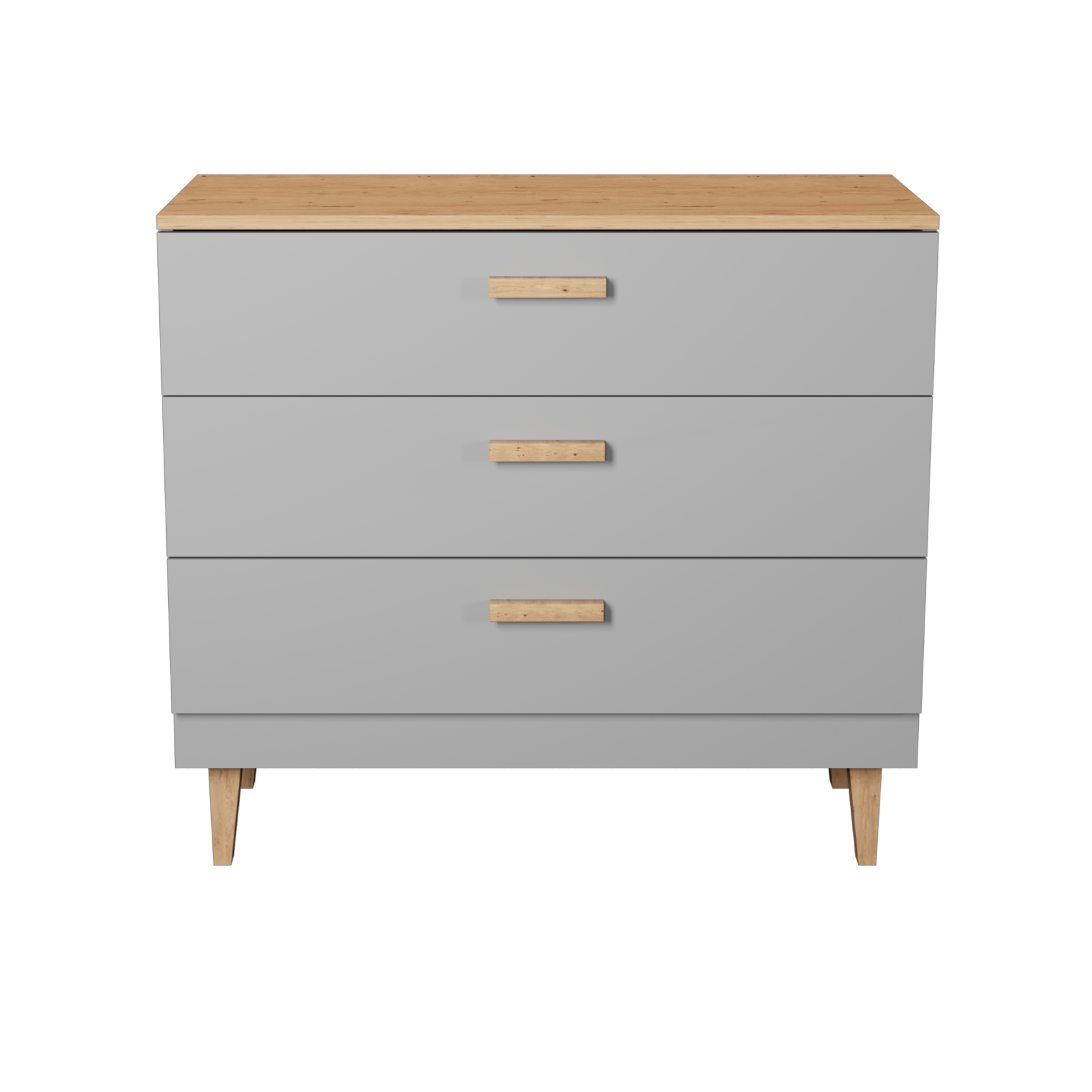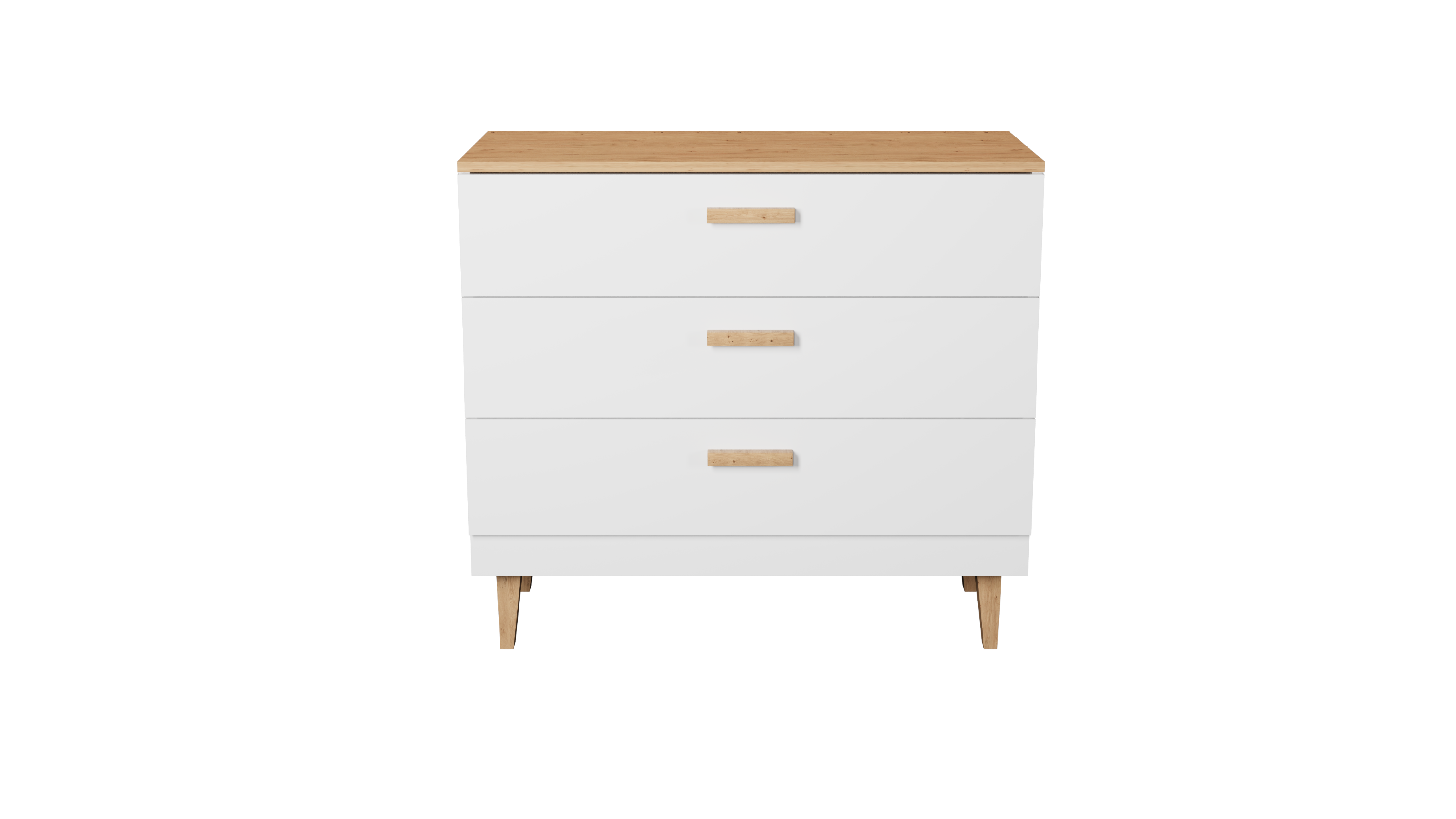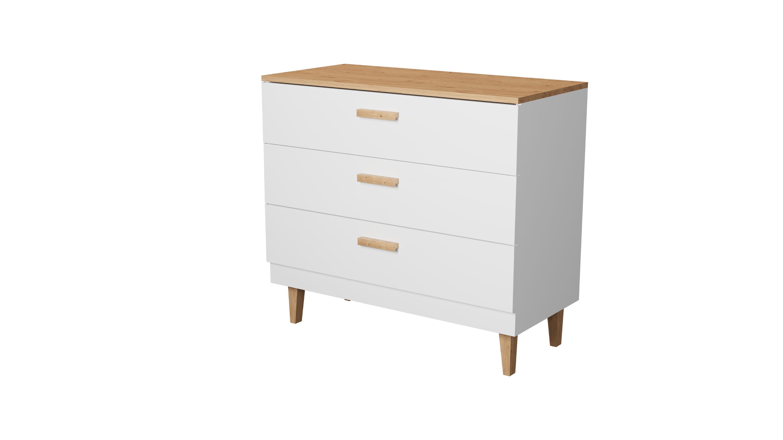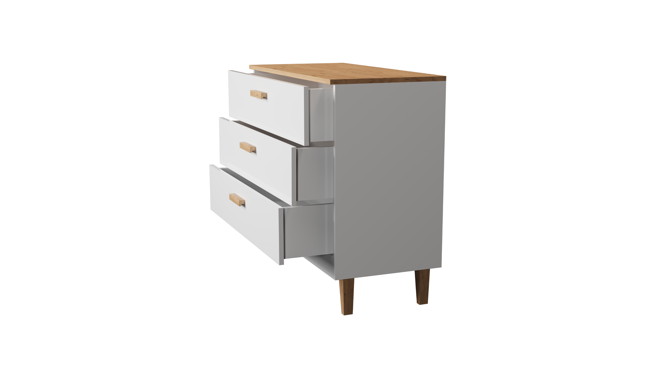 Komodę wyposażono w 3 pojemne szuflady o głębokości 38 cm. Zastosowane prowadnice synchroniczne zapewniają pełny wysuw szuflady oraz łatwość zamykania dzięki systemowi cichego domyku. Dopełnieniem komody są nogi oraz uchwyt z litego drewna dębowego, powlekane ekologicznym, bezbarwnym lakierem oraz blat w kolorze hikora. Meble występują w kolorze białym i szarym.