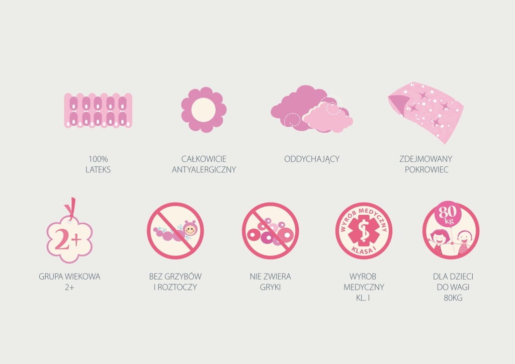 UWAGI: materac dwustronny, dwie strony użytkowe. Możliwość wykonania rozmiarów nietypowych. Wymagany stelaż szczebelkowy płaski lub elastyczny o rozstawie szczebelków 3-5 cm. Rekomendowany stelaż Hevea Junior.
