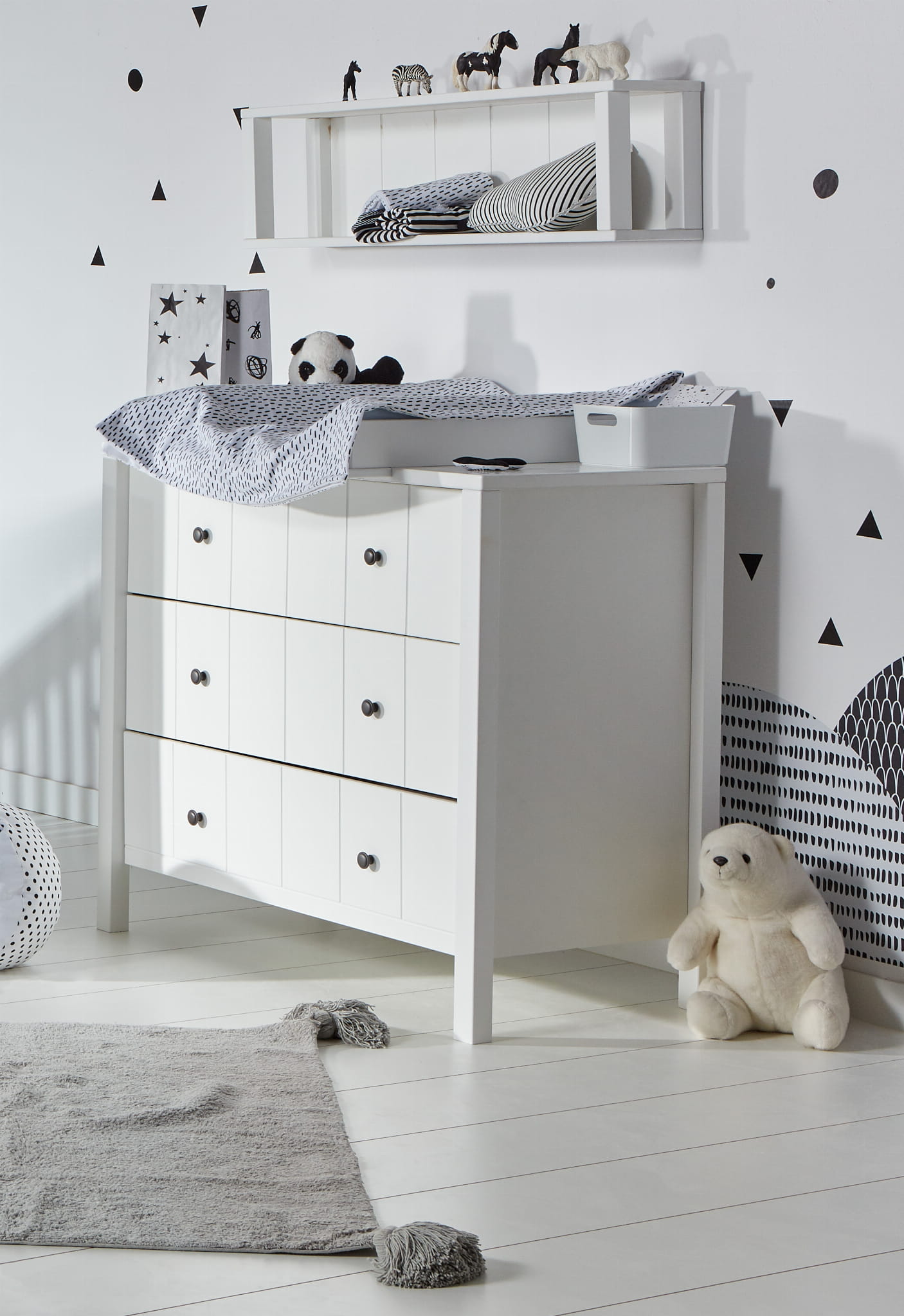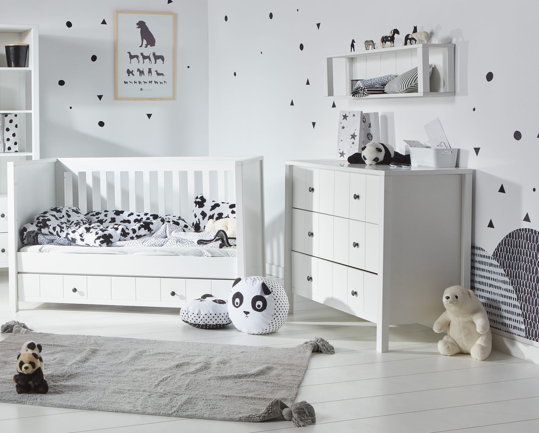 Minimalistyczną kolekcję Allpin przełamują czarne uchwyty. Dla urozmaicenia, na frontach znajdują się pionowe frezy imitujące deski. Połączenie klasycznej czerni i bieli sprawia, że kolekcja pasuje zarówno do pokoju chłopca, jak i dziewczynki, spełni potrzeby niemowlaka i sprosta oczekiwaniom wymagającego nastolatka. Drugą opcją kolorystyczną jest bardzo elegancka gołębia szarość. Wystarczy zmienić detale, by cieszyć się kolekcją Allpin przez lata. Meble wyróżnia solidna konstrukcja – kwadratowe nogi to fragment zewnętrznej deski, która zapewnia stabilność, ponieważ biegnie przez całą wysokość. Meble pomalowane są bezpiecznymi farbami, dlatego możemy je zamówić także do pokoju alergika.