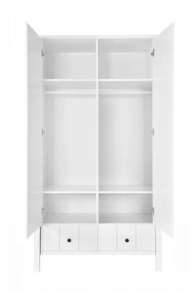 • wewnątrz 5 półek w tym 4 z możliwością regulacji położenia . Na górze jedna półka na całej szerokości szafy. Lewa strona szafy; drążek wieszakowy, a pod nim jedna półka z możliwością regulacji położenia. Prawa strona szafy; 3 półki z możliością regulacji położenia