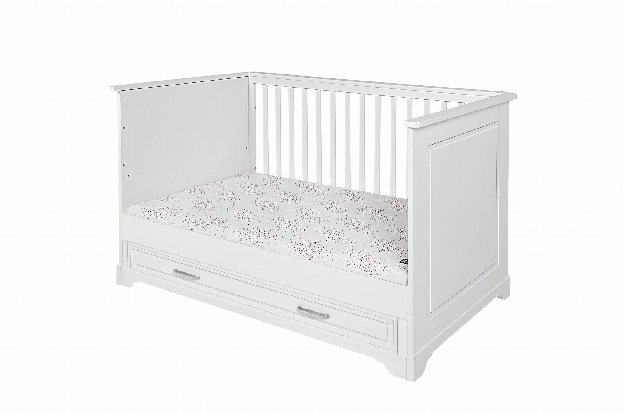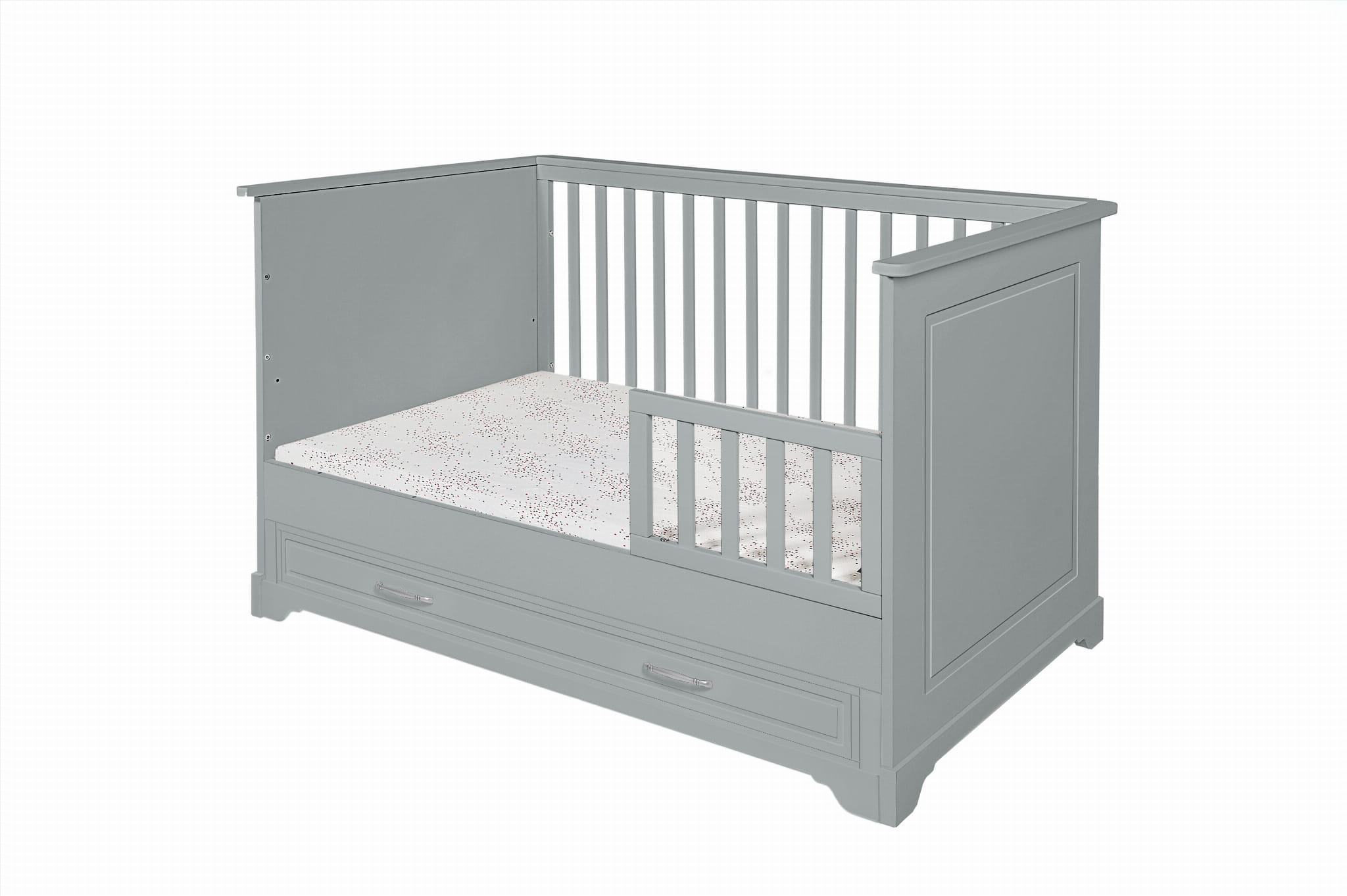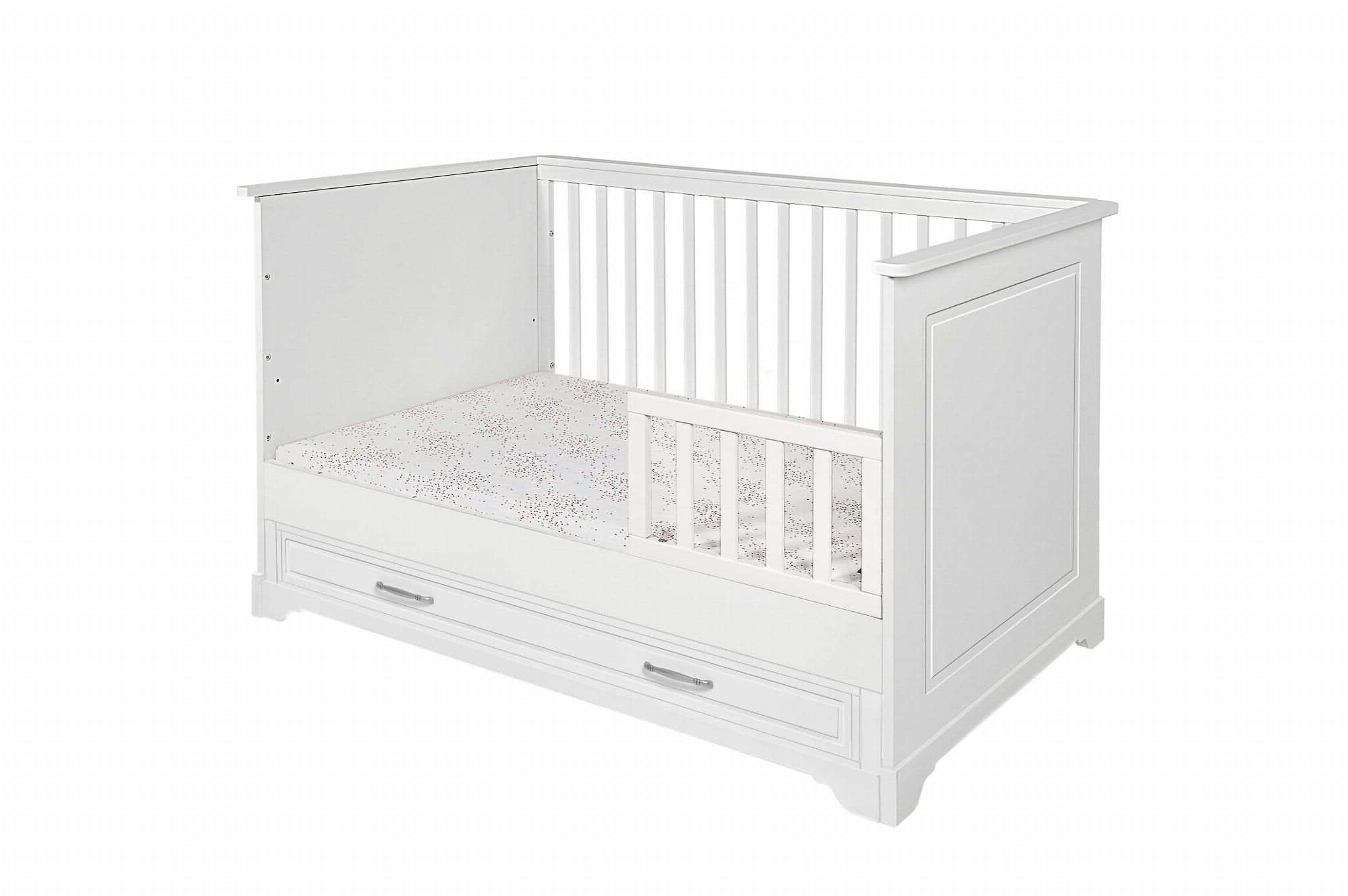 • w zestawie barierka ochronna zabezpieczająca przed wypadaniem po zmianie łóżeczka na tapczanik, barierkę można zamontować po prawej lub lewej stronie łóżeczka