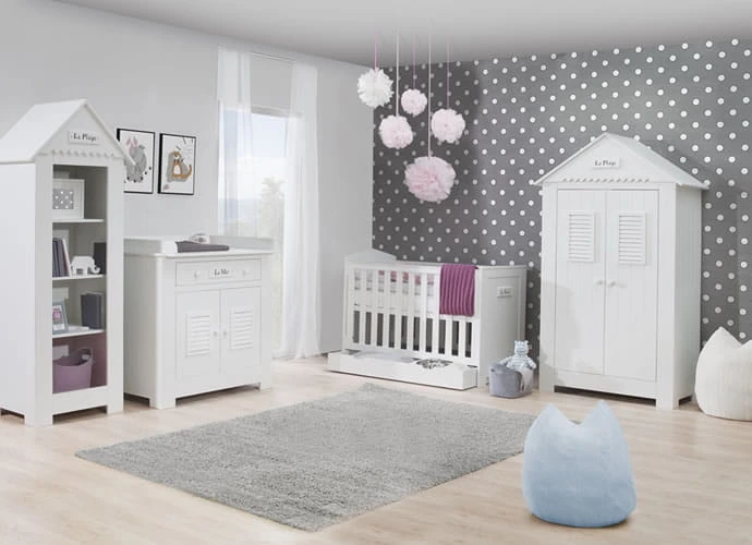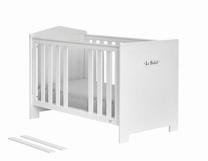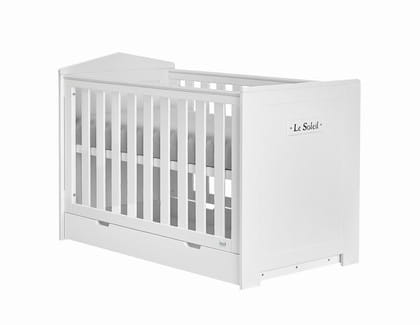 Łóżeczko Marsylia MDF wyposażone jest w dekor z napisem 'Le Soleil' (fr. słońce) dzięki czemu stanowi jeden z elementów kolekcji Marsylia MDF. Doskonale spełnia swoją funkcję także jako samodzielny element. Dostępne jest bez materaca, stelaż pod materac jest zawsze dołączony. Pasuje zarówno do pokoiku chłopca, jak i dziewczynki. Do łóżeczka można dokupić szufladę oraz materac Pinio Sensitive.