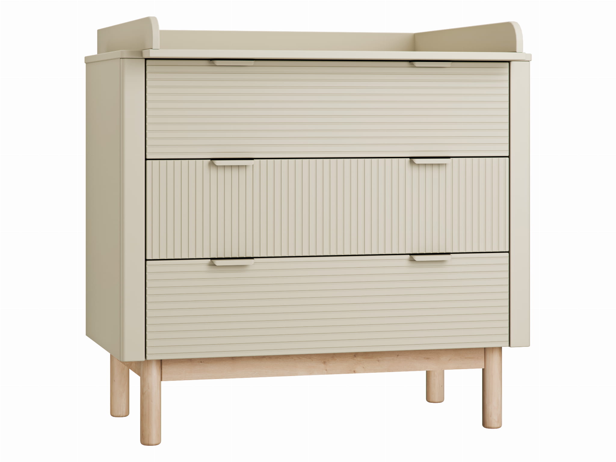 Stylowa komoda dysponuje trzema szufladami, które działają na prowadnicach najwyższej klasy, wyposażonych w hamulec oraz funkcję samodomyku. Dla dodatkowego komfortudostępna jest opcja dokupienia demontowalnej nakładki przeznaczonej do przewijania.