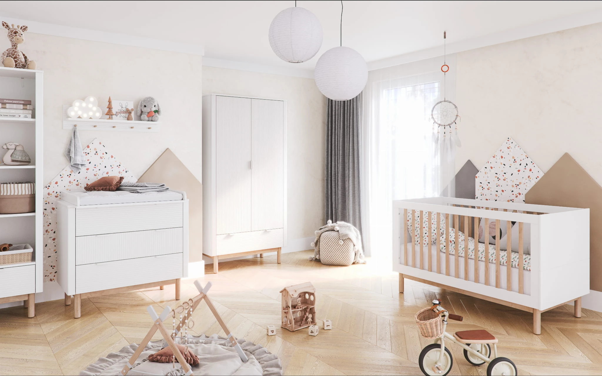 Design łóżeczka kładzie nacisk na detal i elegancję – ryflowane fronty dodają charakteru i klasy, zaś delikatnie zaokrąglone narożniki gwarantują bezpieczeństwo młodych użytkowników.