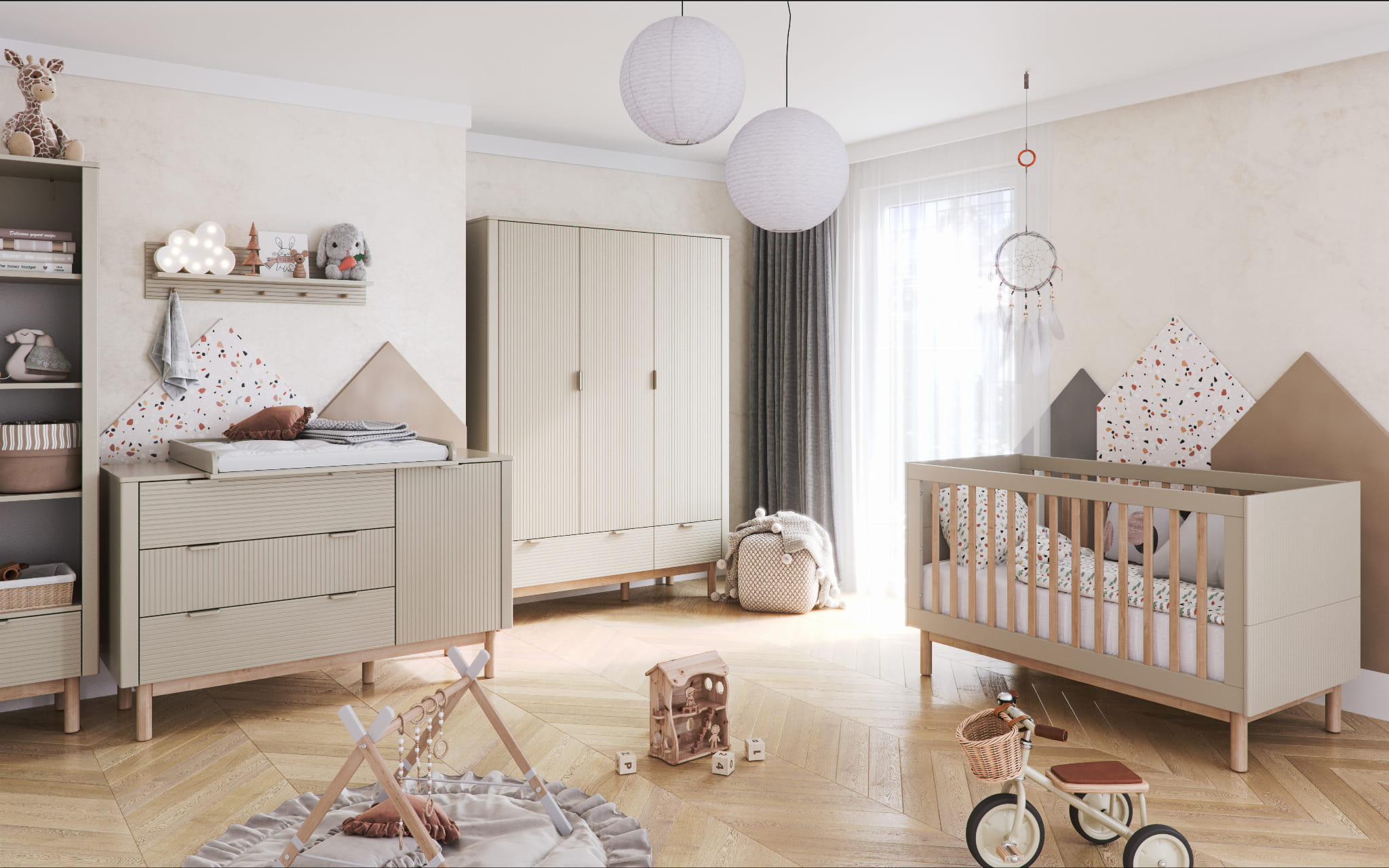 Design łóżeczka kładzie nacisk na detal i elegancję – ryflowane fronty dodają charakteru i klasy, zaś delikatnie zaokrąglone narożniki gwarantują bezpieczeństwo młodych użytkowników.