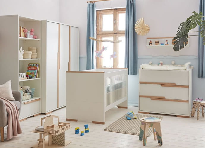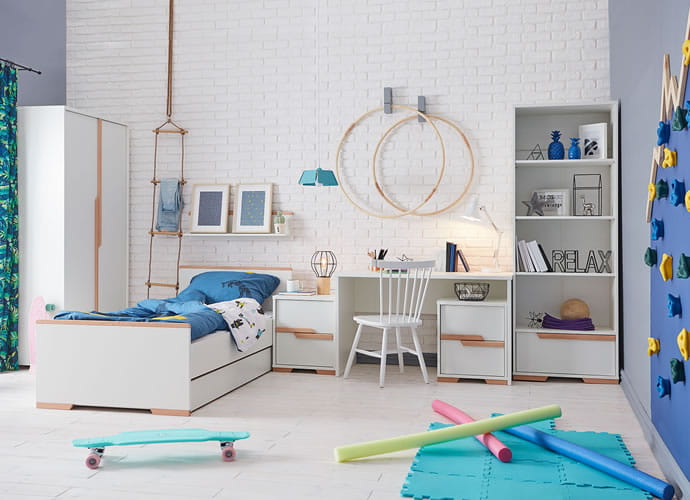 Regał wykonany jest z malowanej płyty MDF, płyty laminowanej (korpus, elementy wewnętrzne) oraz z drewna bukowego (elementy w kolorze drewna). Został pomalowany ekologicznymi farbami wodnymi, dzięki czemu zapewniono mu prawidłowy proces oddychania oraz wyeliminowano czynnik mogący powodować u dzieci alergie. Występuje w kolorze białym i szarym. Pasuje zarówno do pokoiku chłopca, jak i dziewczynki.