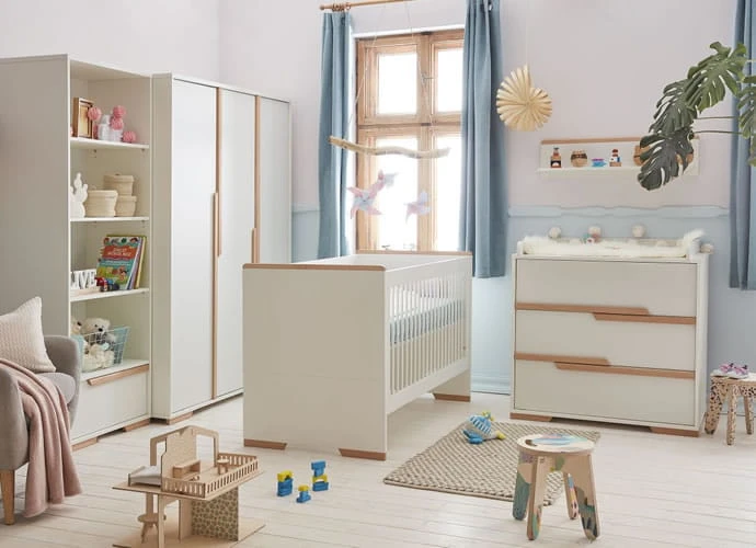 Szafa wykonana jest z malowanej płyty MDF, płyty laminowanej (korpus, elementy wewnętrzne) oraz z drewna bukowego (elementy w kolorze drewna). Komoda została pomalowana ekologicznymi farbami wodnymi, dzięki czemu zapewniono mu prawidłowy proces oddychania. Występuje w kolorze białym i szarym. Pasuje zarówno do pokoiku chłopca, jak i dziewczynki.
