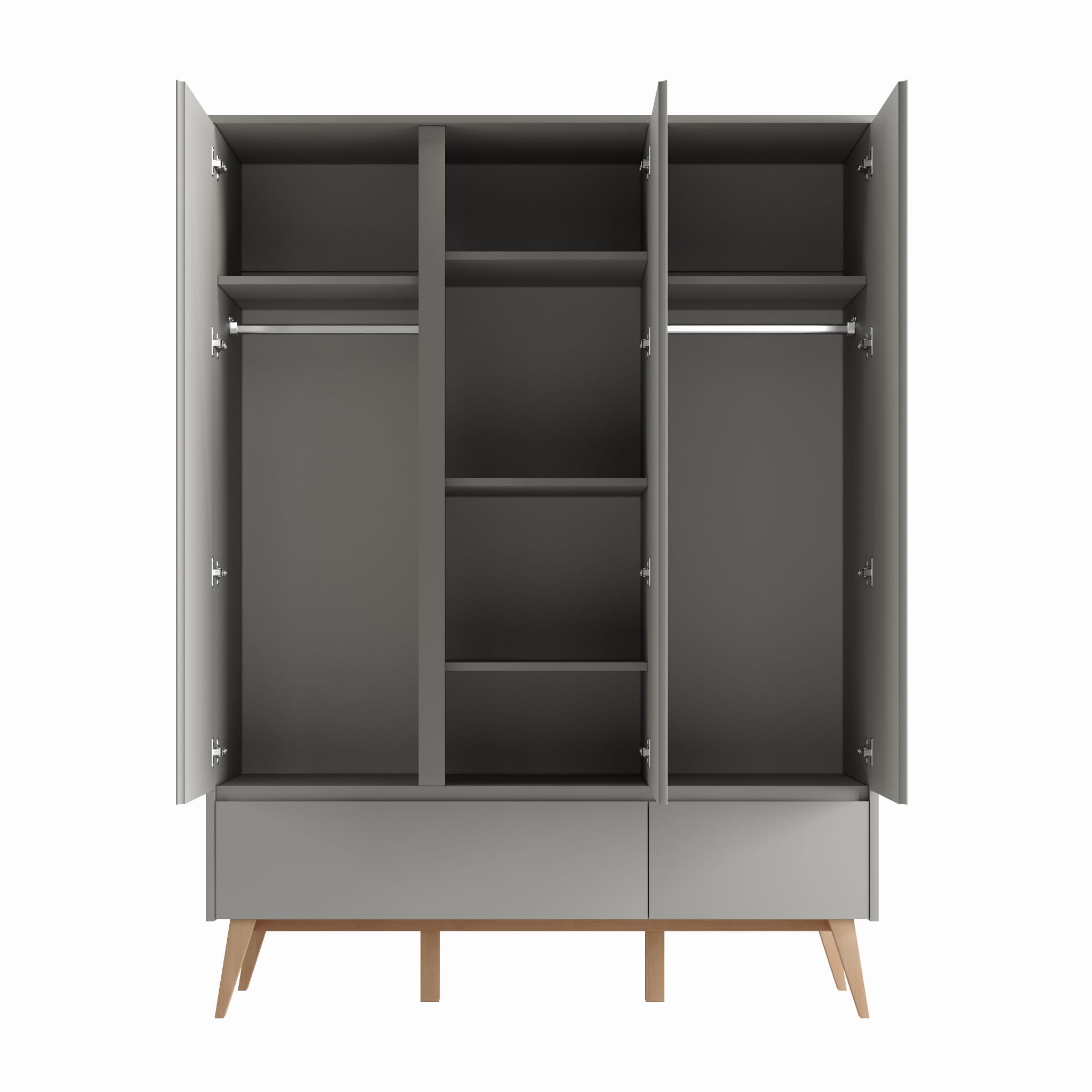 Pojemna szafa 3-drzwiowa z kolekcji Swing z systemem cichego zamykania wysokiej jakości. Wewnątrz 2 przegrody pionowe oraz różne możliwości aranżacji wnętrza szafy – 3 półki w środkowej części oraz np. 1 półka i drążek z jednej strony i 1 półka i drążek na ubrania z drugiej strony – w standardzie 3 półki do środkowej części oraz 2 półki i 2 drążki na ubrania do części zewnętrznych – możliwość dokupienia dodatkowych półek (maksymalnie 4 sztuki). Środkowe drzwi mogą zostać zamontowane zarówno z lewej jak i z prawej strony.