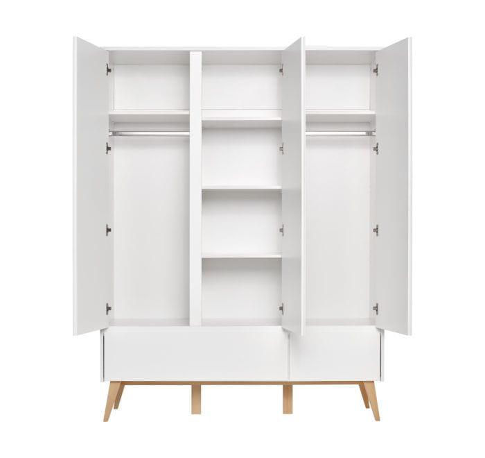 Pojemna szafa 3-drzwiowa z kolekcji Swing z systemem cichego zamykania wysokiej jakości. Wewnątrz 2 przegrody pionowe oraz różne możliwości aranżacji wnętrza szafy – 3 półki w środkowej części oraz np. 1 półka i drążek z jednej strony i 1 półka i drążek na ubrania z drugiej strony – w standardzie 3 półki do środkowej części oraz 2 półki i 2 drążki na ubrania do części zewnętrznych – możliwość dokupienia dodatkowych półek (maksymalnie 4 sztuki). Środkowe drzwi mogą zostać zamontowane zarówno z lewej jak i z prawej strony.