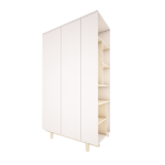 Piękna, klasyczna szafa w kolorze złamanej bieli oraz naturalnego drewna. Szafa zaprojektowana jest tak aby zapewnić jak najwięcej miejsca do przechowywania. Po lewej stronie znajduje się przestrzeń przeznaczona do wieszania ubrań wyposażona w dwa drążki natomiast po prawej sześć pojemnych półek. Drzwi szafy wyposażone są w wysokiej jakości zawiasy z systemem push-to-open, dzięki którym za pomocą kliknięcia można je otworzyć. W boku komody znajduje się regał będący nie tylko dodatkowym miejscem do przechowywania ale też elementem dekoracyjnym. Regał może być montowany zarówno po prawej lub po lewej stronie szafy.