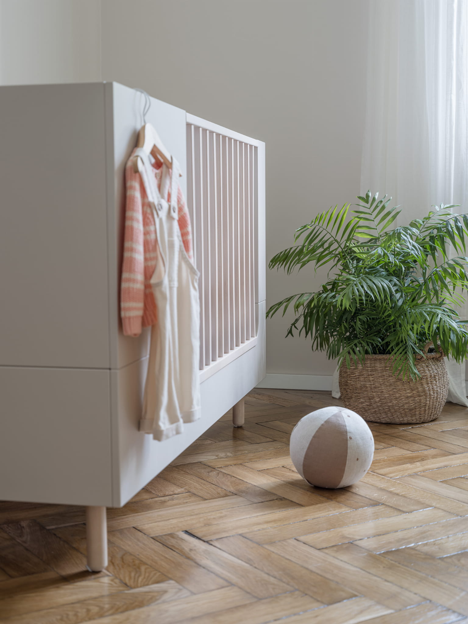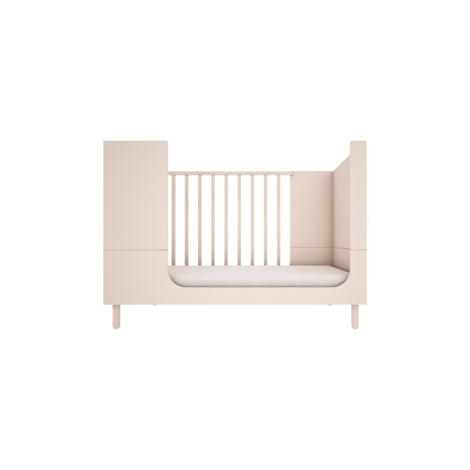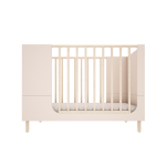 Łóżeczko zaprojektowane jest tak aby rosło razem z dzieckiem. Posiada 3 poziomy regulacji bazy pod materac oraz zawiera wszystkie potrzebne elementy do przekształcenia go najpierw w sofkę (demontaż jednej z ramek bocznych) a następnie w tapczanik dla starszego dziecka. Do łóżeczka pasuje materac o wymiarach 70×140 cm.